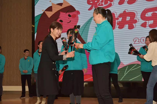 斯可馨副总戴桂飞为上台参加文艺表演的员工献上鲜花