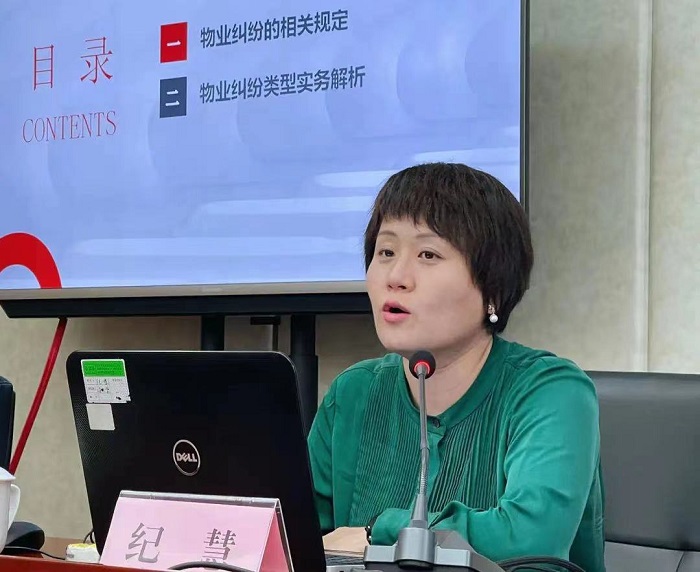 聘请了江苏孚佑律师事务所——纪慧律师进行“面对面普法”授课,培训以《民法典》为切入点,通过以ppt的方式结合具体案例,以邻里间引起的《物权法》问题、小区业主和物业之间矛盾纠纷案例、业主委员会成立的条件与流程等,以及围绕调解工作中遇到的难点、重点问题,深入浅出地讲解了“物权篇”的相关法律知识。