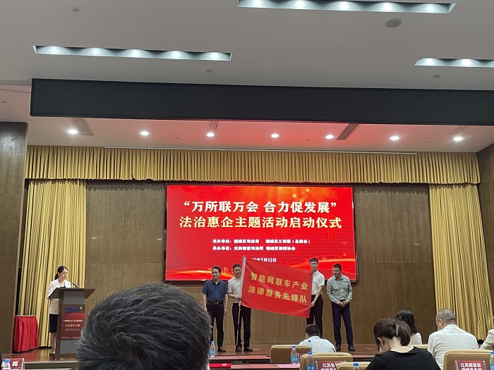 相城区司法局局长刘洪印为“智能网联车产业法律服务先锋队”授旗。