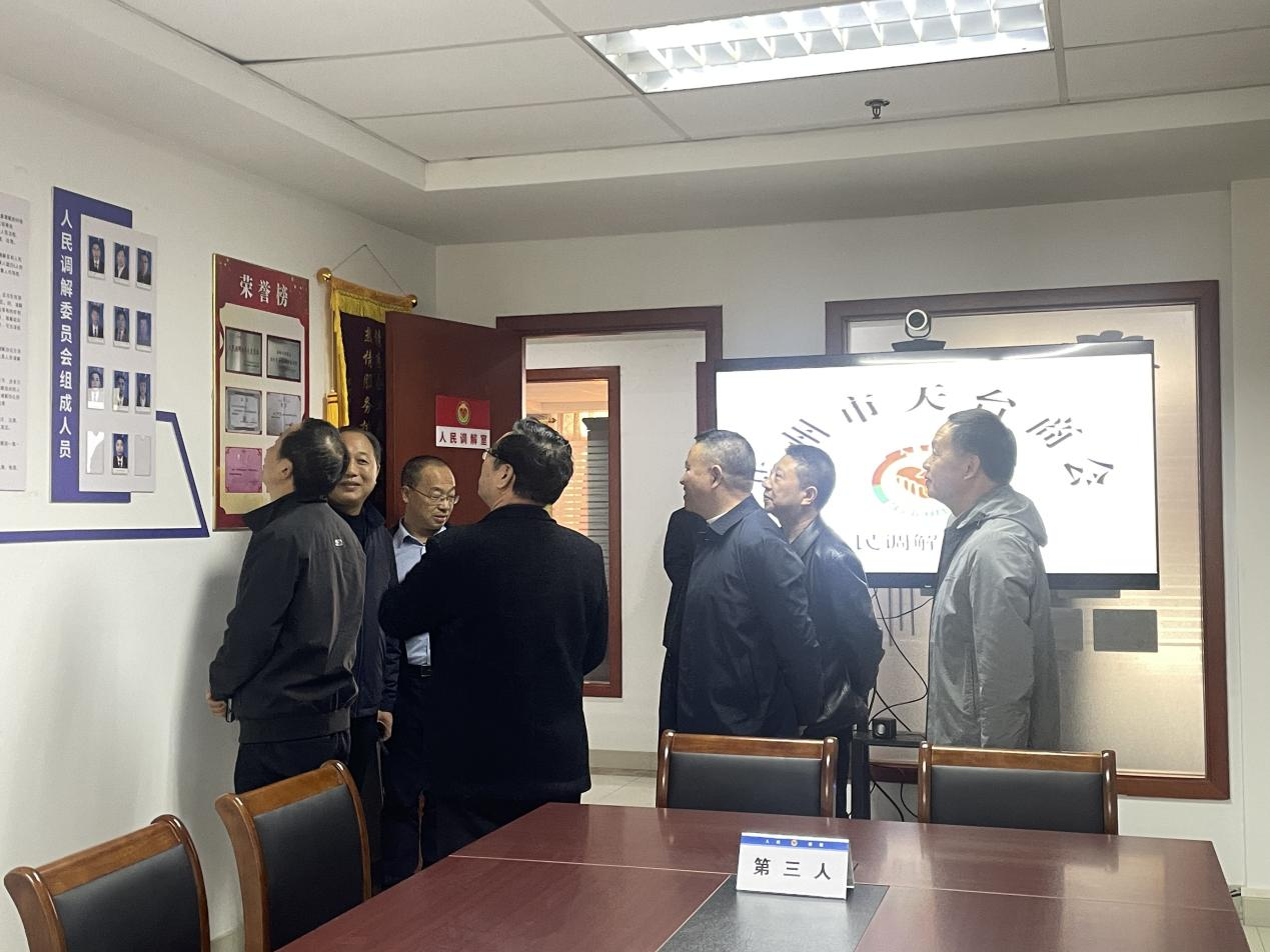 在人民调解室认真了解人民调解委员会的组织架构和成员情况。