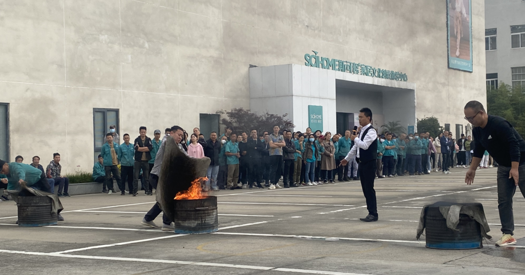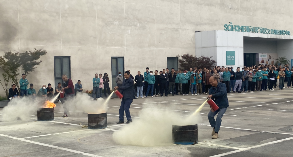 随后,斯可馨家居安全组成员进行消防演习,针对不同的起火状况采取不同的灭火办法,并组织员工进行安全演练。