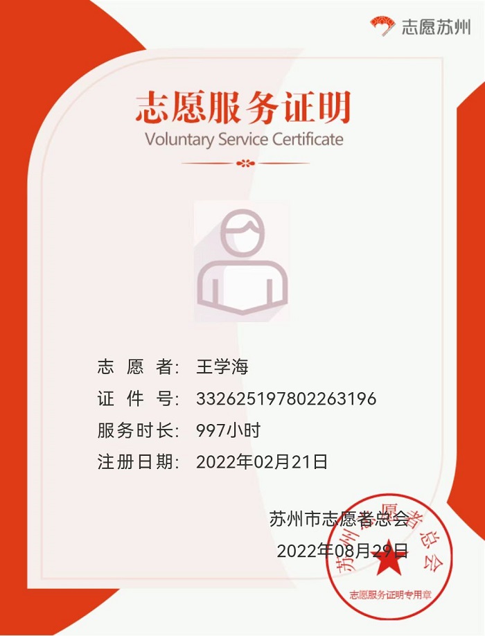 此时,所讲的是多次参加过吴中区木渎镇西跨塘社区核酸检测采样志愿活动,坚守长浜社区核酸检测采样常态化志愿任务,维护秩序、采集信息、核酸采样等环节都认真负责,他被吴中区木渎镇新冠肺炎疫情联防联控指挥部任命为木渎镇长浜社区新旅城七区“点位长”,后来又安排木渎镇长浜社区华夏机电五金城任“点位长”,他是天台县流动党员苏州总支部学习委员兼北桥支部组织委员王学海,从2.13疫情爆发以来,至今天他已经累计疫情志愿服务时长997小时,997小时包涵身为一名共产党员一百多天日夜奋战在抗击疫情的第一线,这股强大的力量和决心,让大家有信心、有能力、有把握打赢这场疫情防控阻击战。