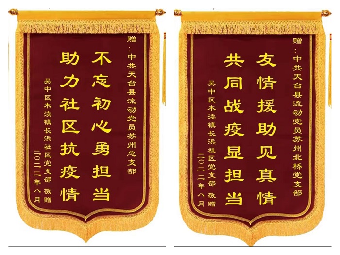 近日,吴中区木渎镇长浜社区党支部向天台县流动党员苏州总支部、北桥党支部深表谢意,并赠予两面锦旗。